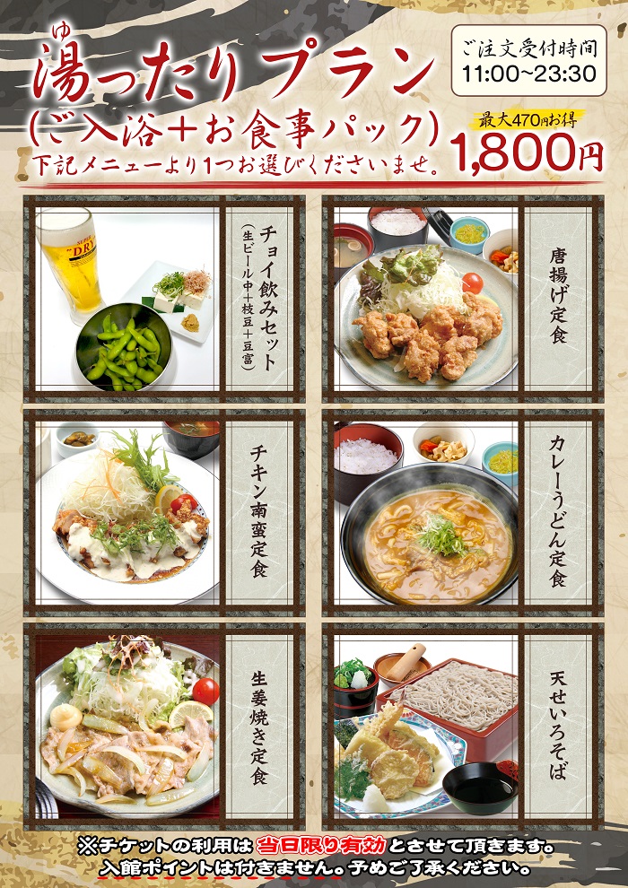 | 回数券でお食事していただけます。 はなの湯回数券1枚で下記のお食事を ご利用いただけます。 |